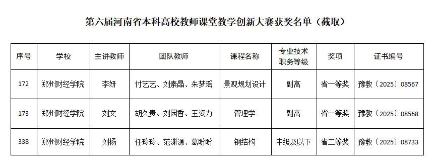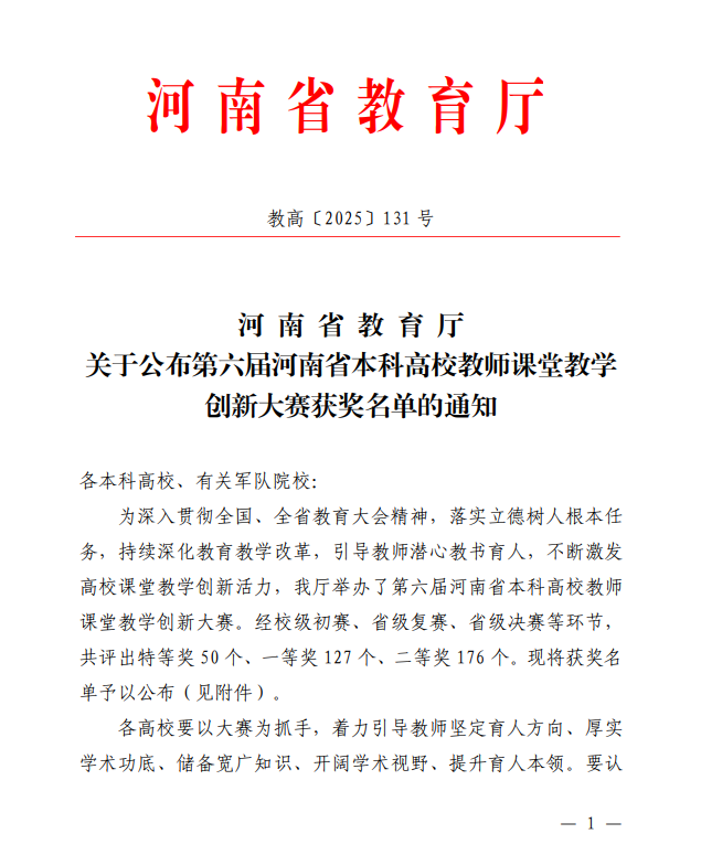 近日,河南省教育厅下发《关于公布第六届河南省本科高校教师课堂教学创新大赛获奖名单的通知》(教高〔2025〕131号)。9428cn太阳集团古天乐艺术设计学院李妍副教授团队、管理学院刘文副教授团队获得一等奖,土木工程学院刘杨教师团队获得二等奖。